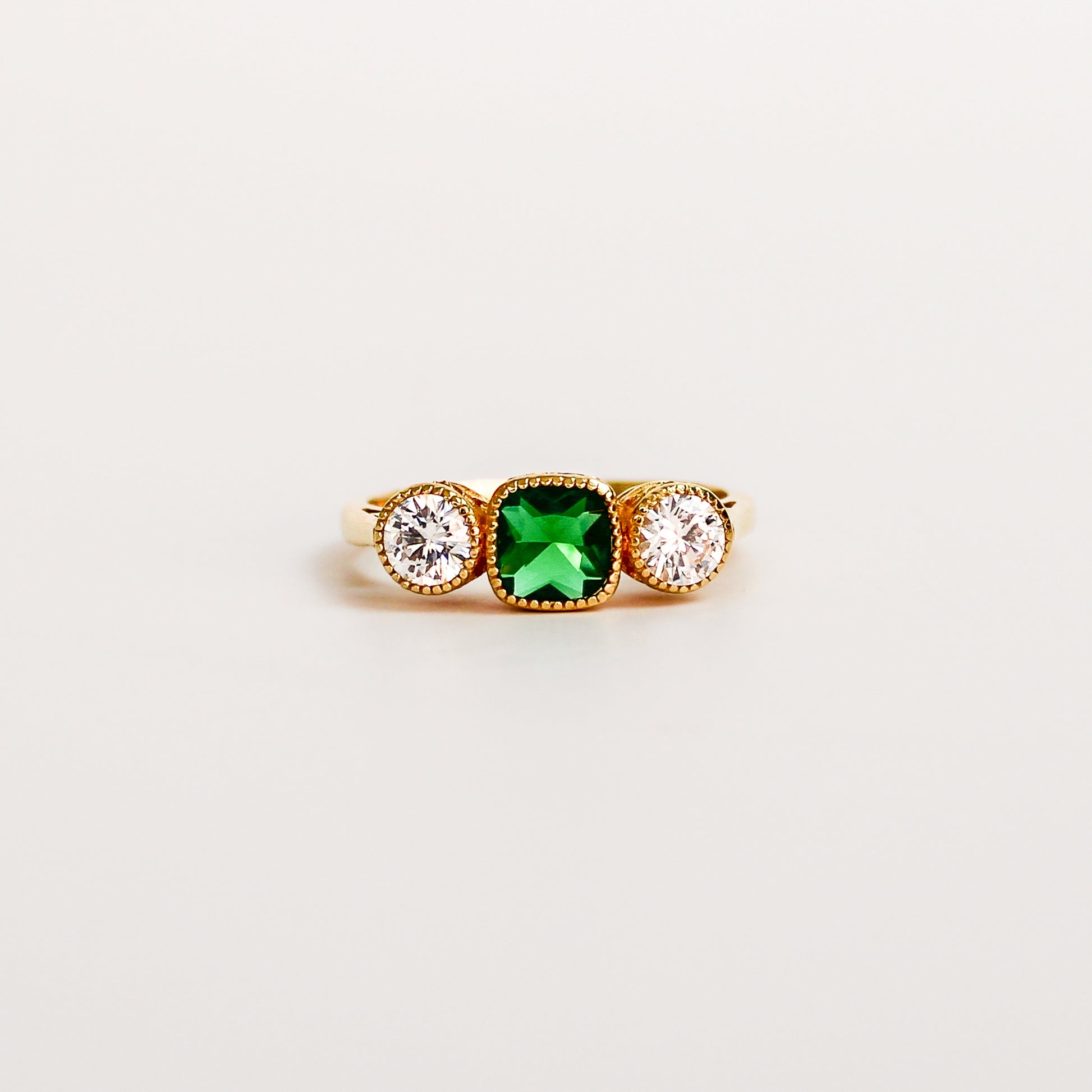 Crafted in gold-plated sterling silver, this ring features a luminous green center gemstone in a beaded bezel setting, flanked by two radiant accents. Along the bridge, delicate Edwardian filigree work adds depth, romance, and the kind of detail only found in heirloom designs. Its soft curves and tapered band create a silhouette that feels both historical and effortlessly modern.