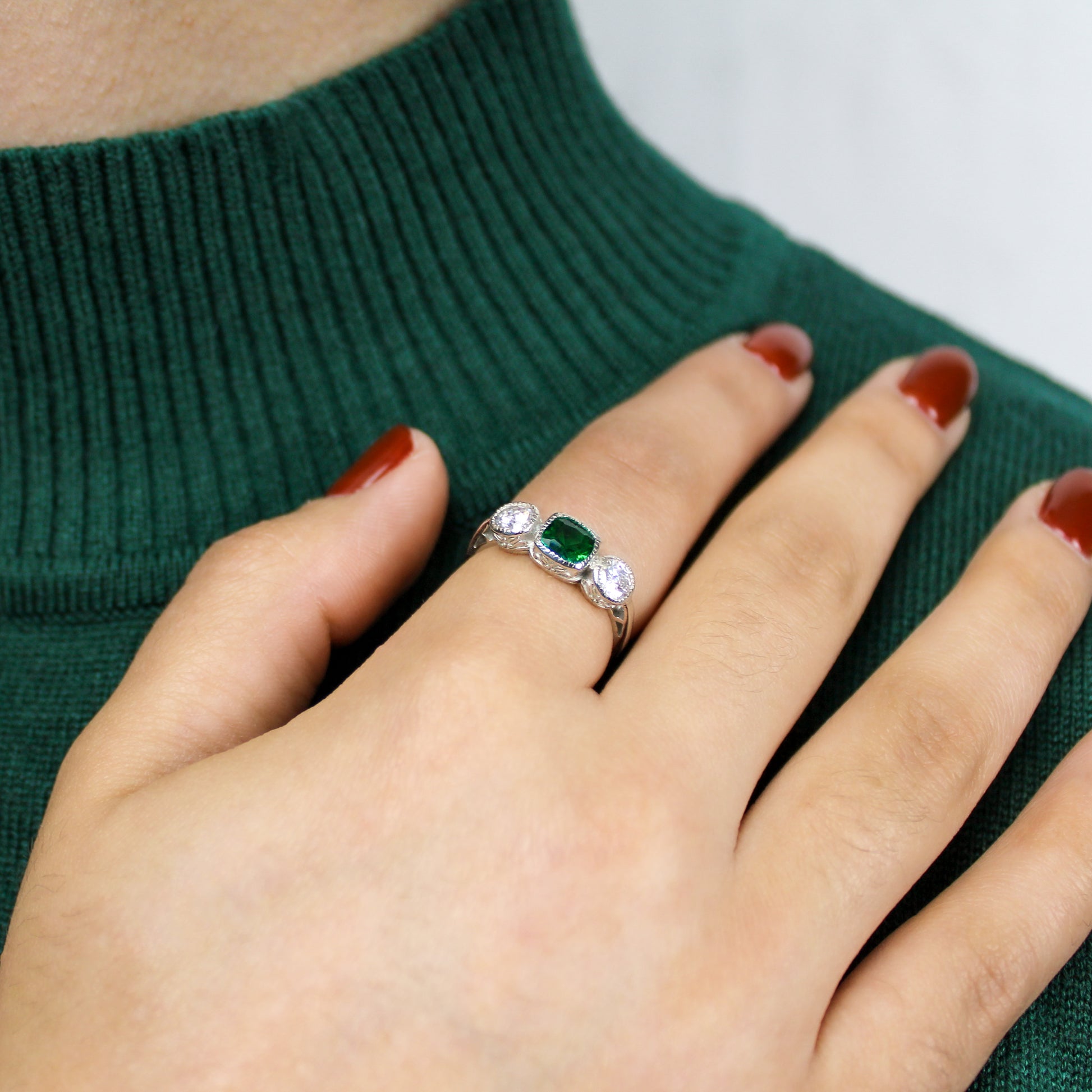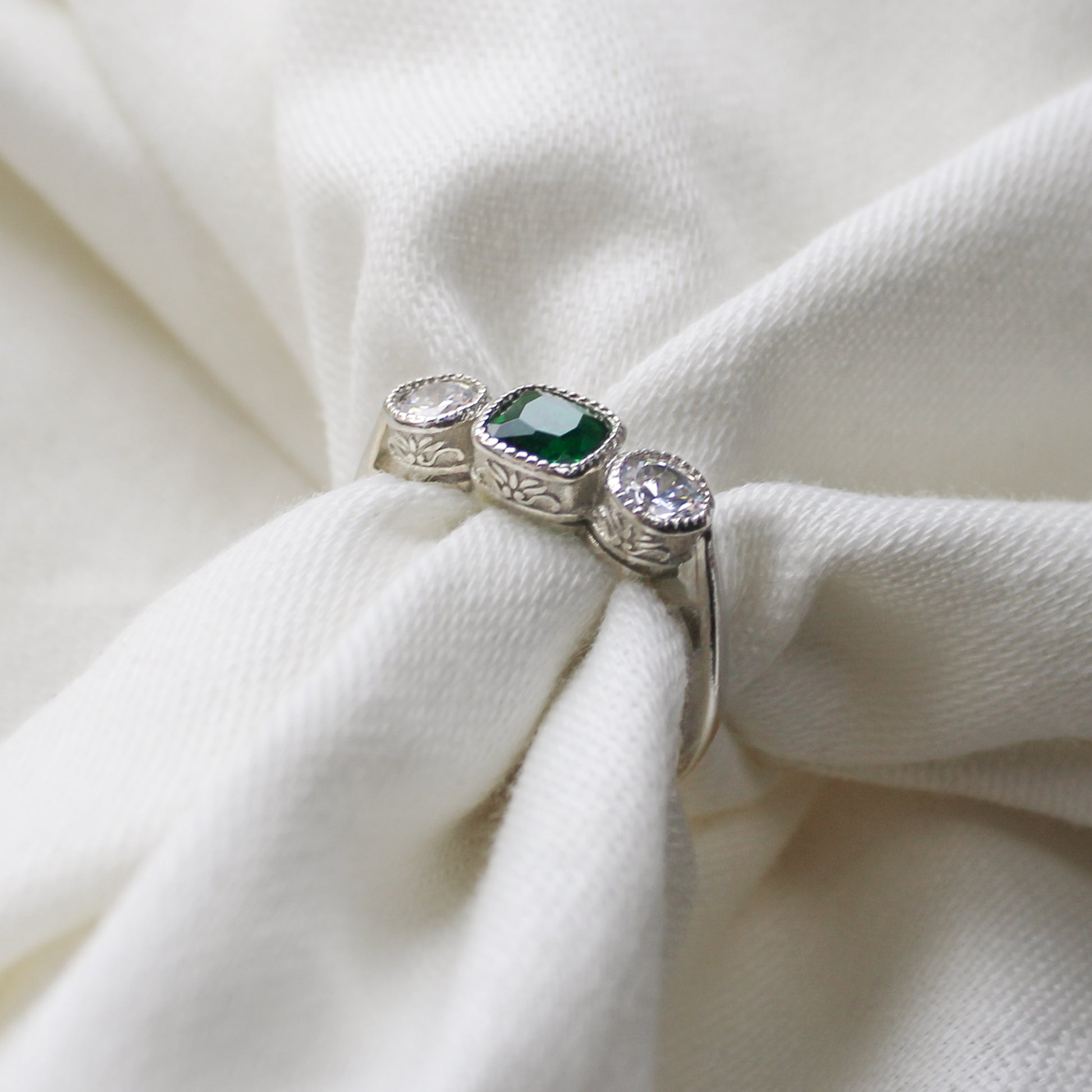 Crafted in rhodium-plated sterling silver, this ring features a luminous green center gemstone in a beaded bezel setting, flanked by two radiant accents. Along the bridge, delicate Edwardian filigree work adds depth, romance, and the kind of detail only found in heirloom designs. Its soft curves and tapered band create a silhouette that feels both historical and effortlessly modern.