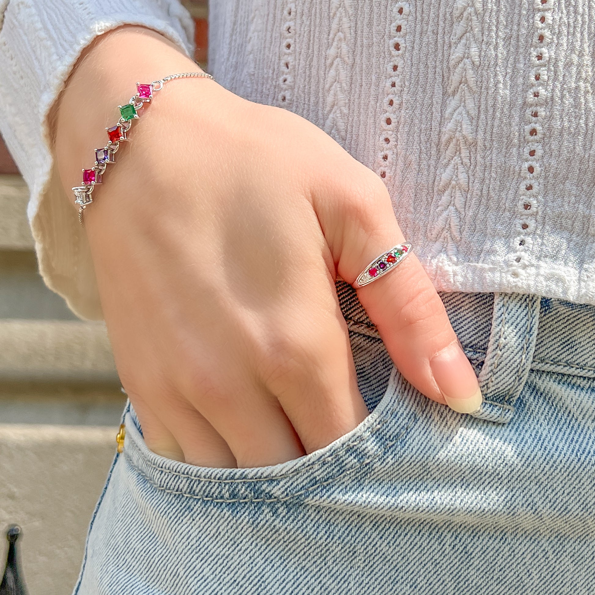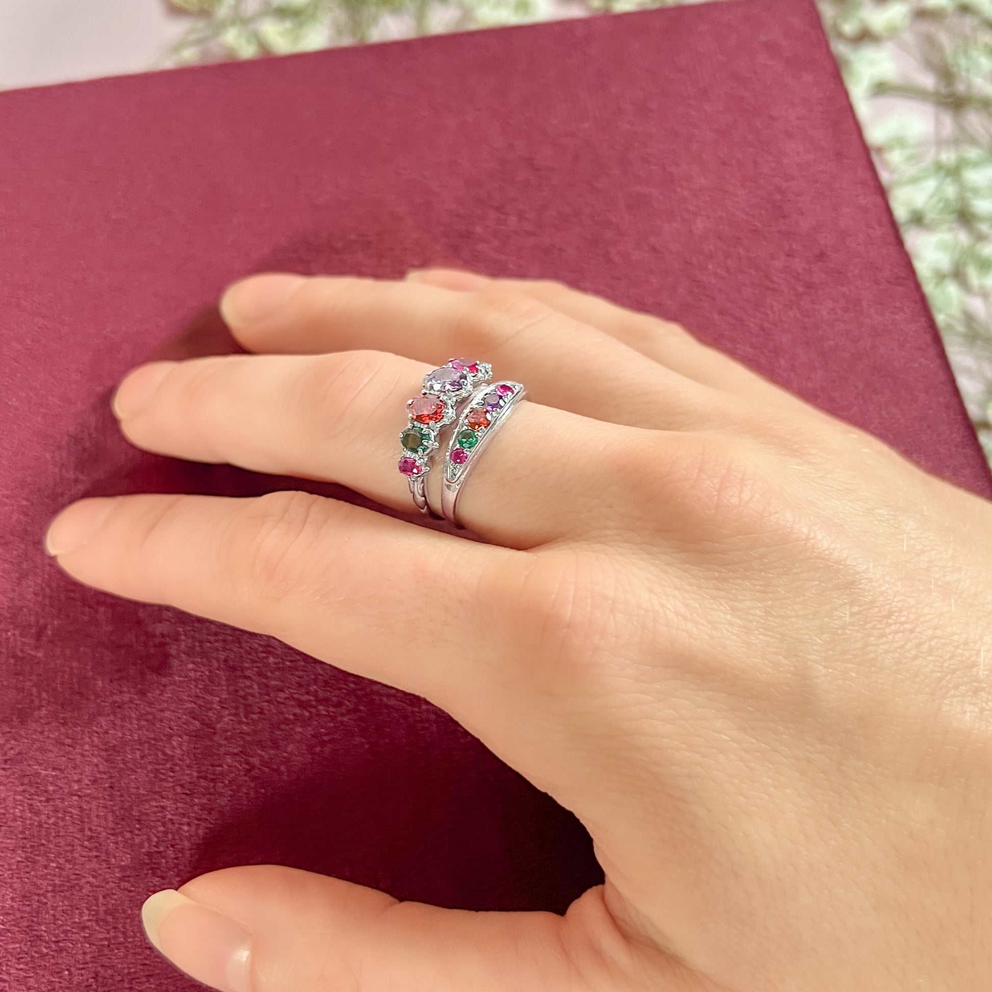 Each stone is nestled within a slim, elongated channel that mimics the silhouette of a folded letter — sleek, structured, and beautifully clean. Handset with care, the gemstones form a line of color and sparkle across the top of the band. The metalwork remains smooth and minimal, allowing the shape and symbolism to shine.