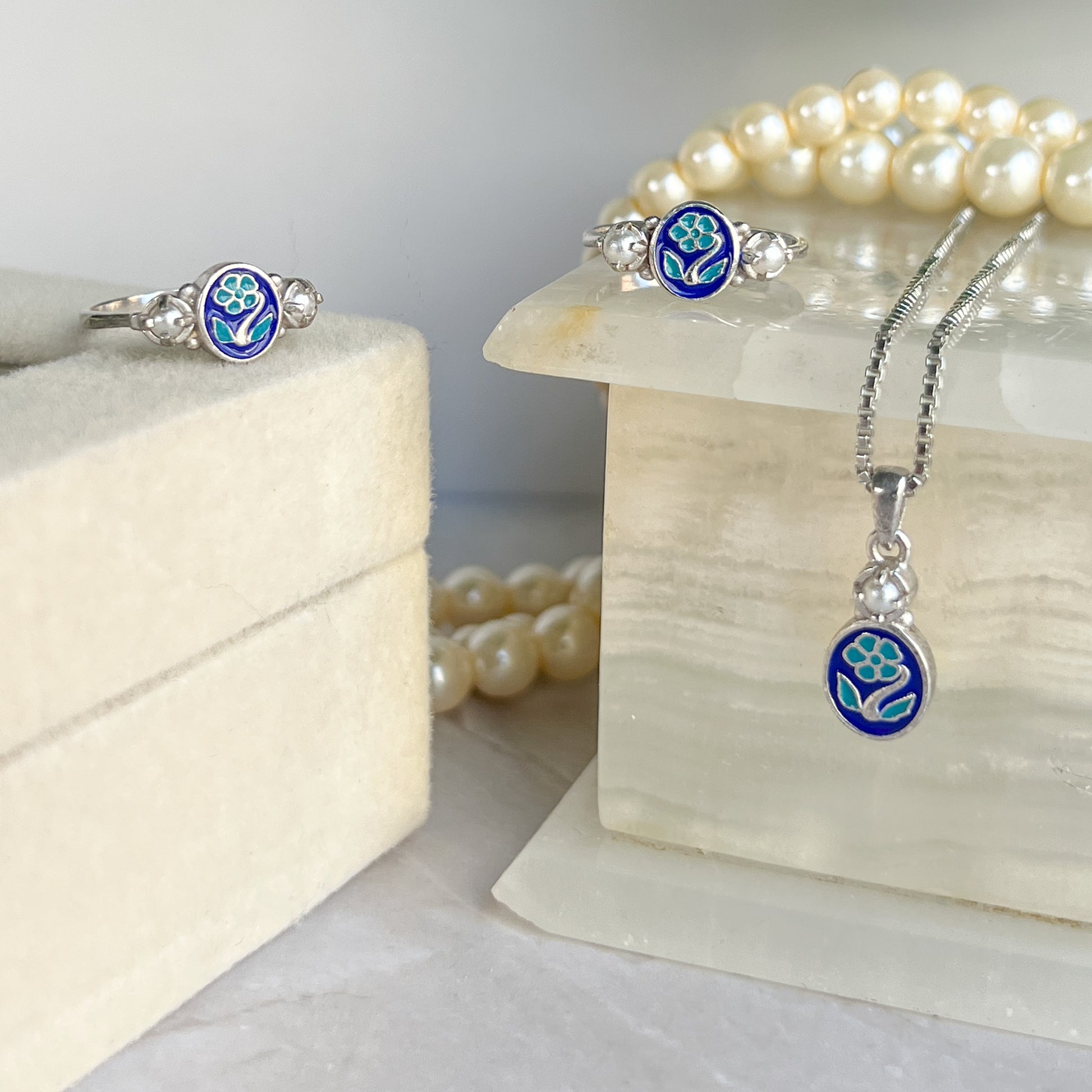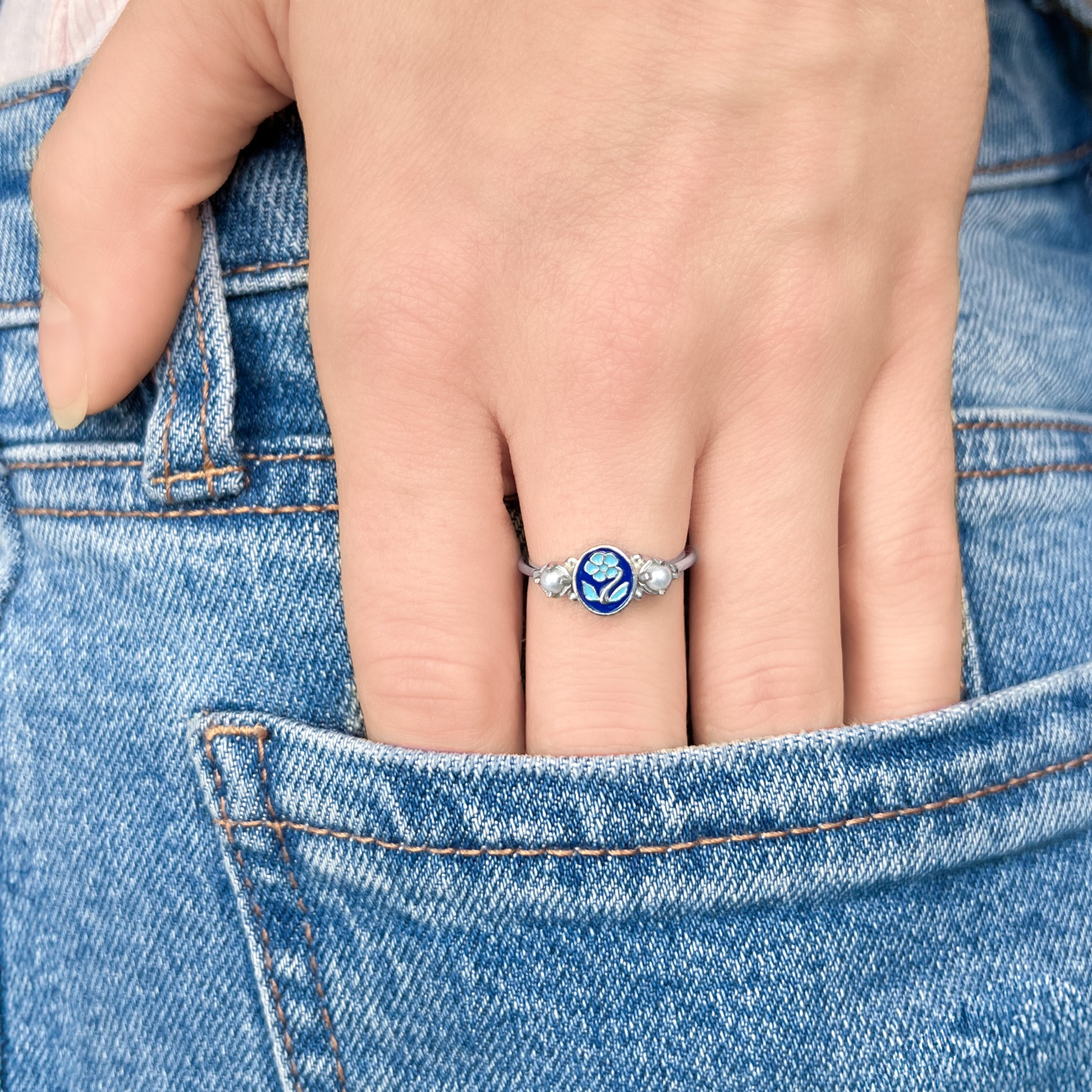 At its center rests a delicately cast forget-me-not motif, finished in soft two-toned blue enamel that seems to glow with emotion. On each side, two luminous pearls sit in classic four-prong settings, a Victorian nod to purity, love, and the tenderness of holding someone in memory. The smooth, gently tapered band creates a quiet balance so the details can speak with intention.