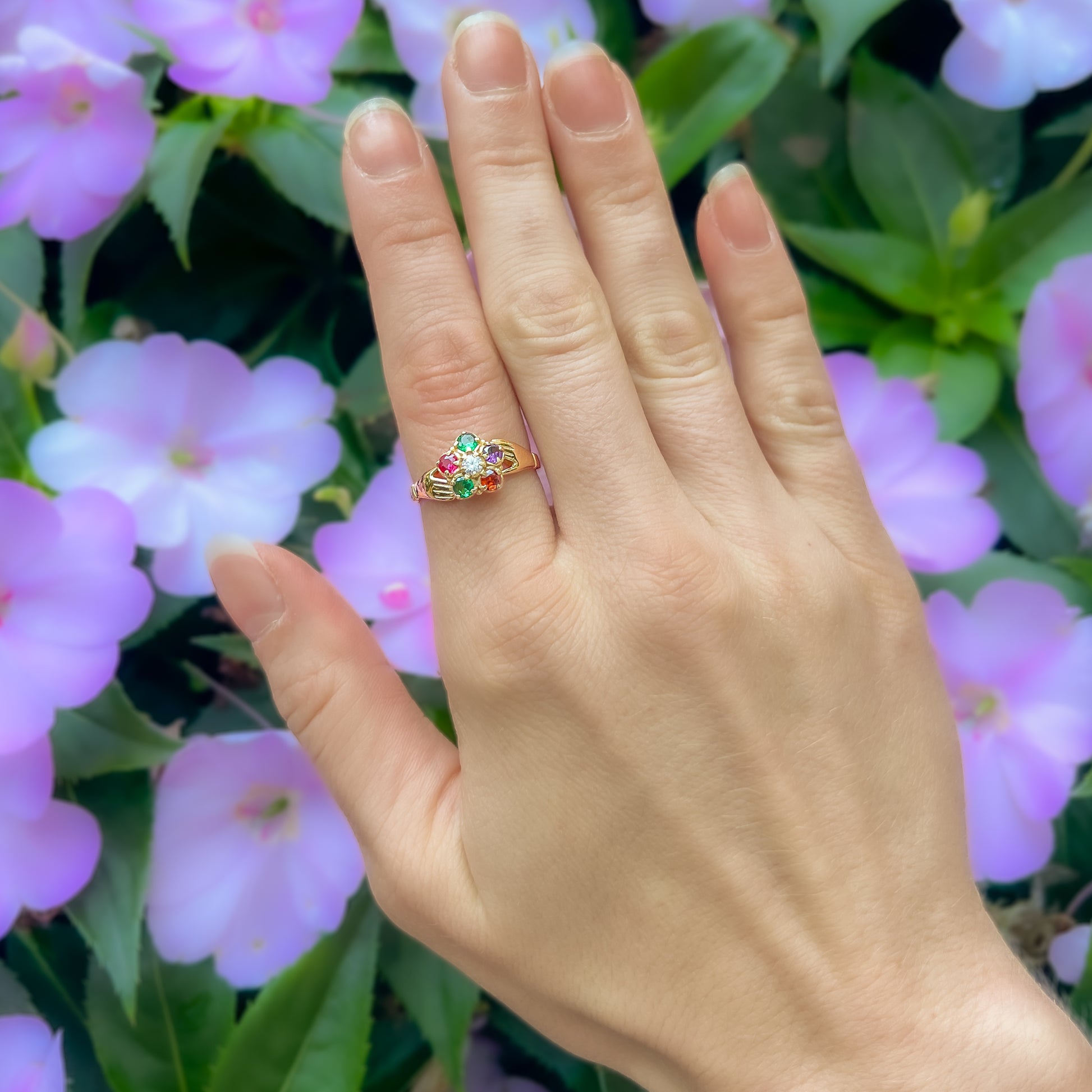Crafted with intention, the Bloom Ring features six handset gemstones arranged in a delicate floral formation, held gently between two clasped hands, a detail inspired by historic fede rings. Each stone is chosen for its fire and clarity, and each hand is sculpted to feel soft, human, and symbolic. Together, they cradle the bloom as if offering it forward a gesture of tenderness preserved in metal.