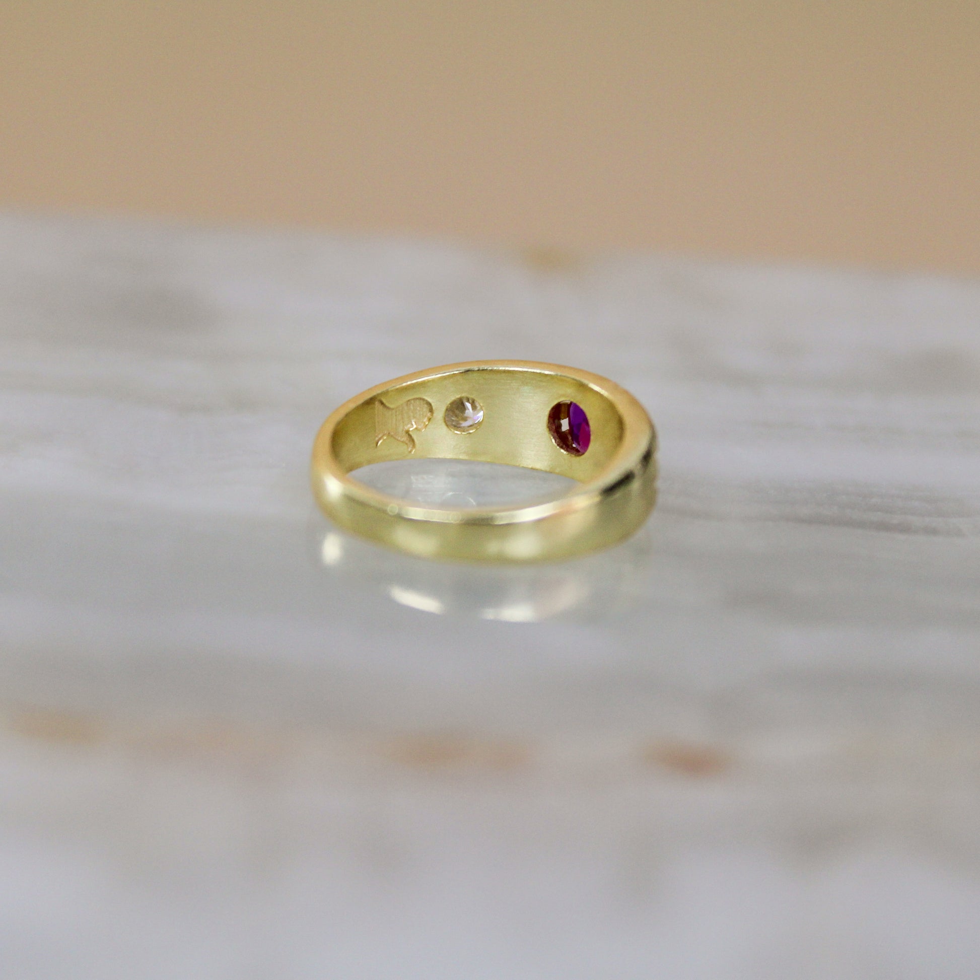 Set with star-engraved details and eight fine prongs, each gemstone is placed with intention. The gentle contrast between the pale center stone and bright accent gems mirrors Victorian color palettes, while the slim, smooth band keeps it wearable and effortless. It feels like a love note: delicate, thoughtful, beautifully balanced.