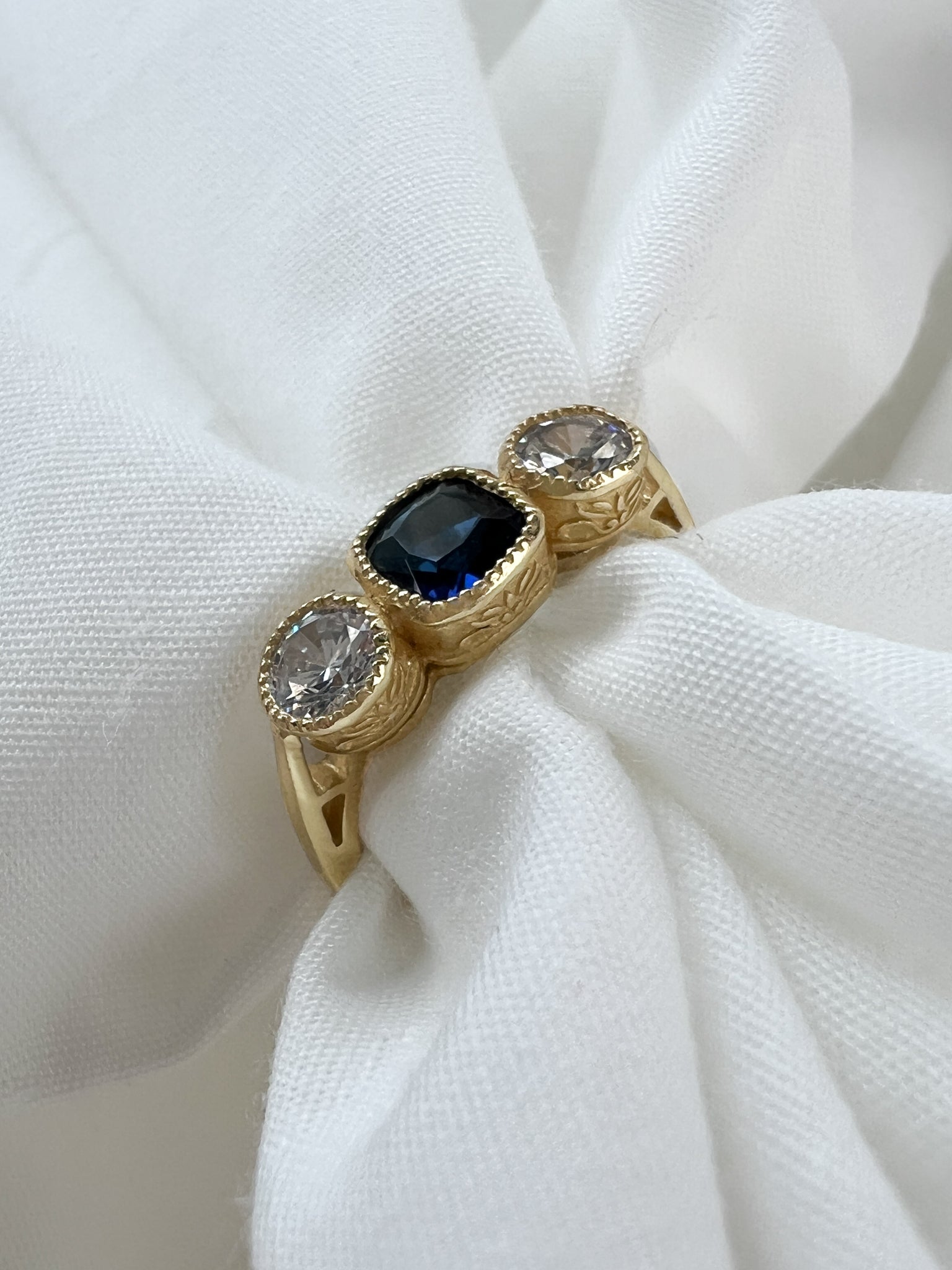 A delicate revival of Edwardian elegance, this three-stone ring features a brilliant blue center stone flanked by two shimmering accents—symbolizing love, friendship, and loyalty. Inspired by heirlooms from the early 1900s, it captures the grace and romance of a bygone era, reimagined for today.