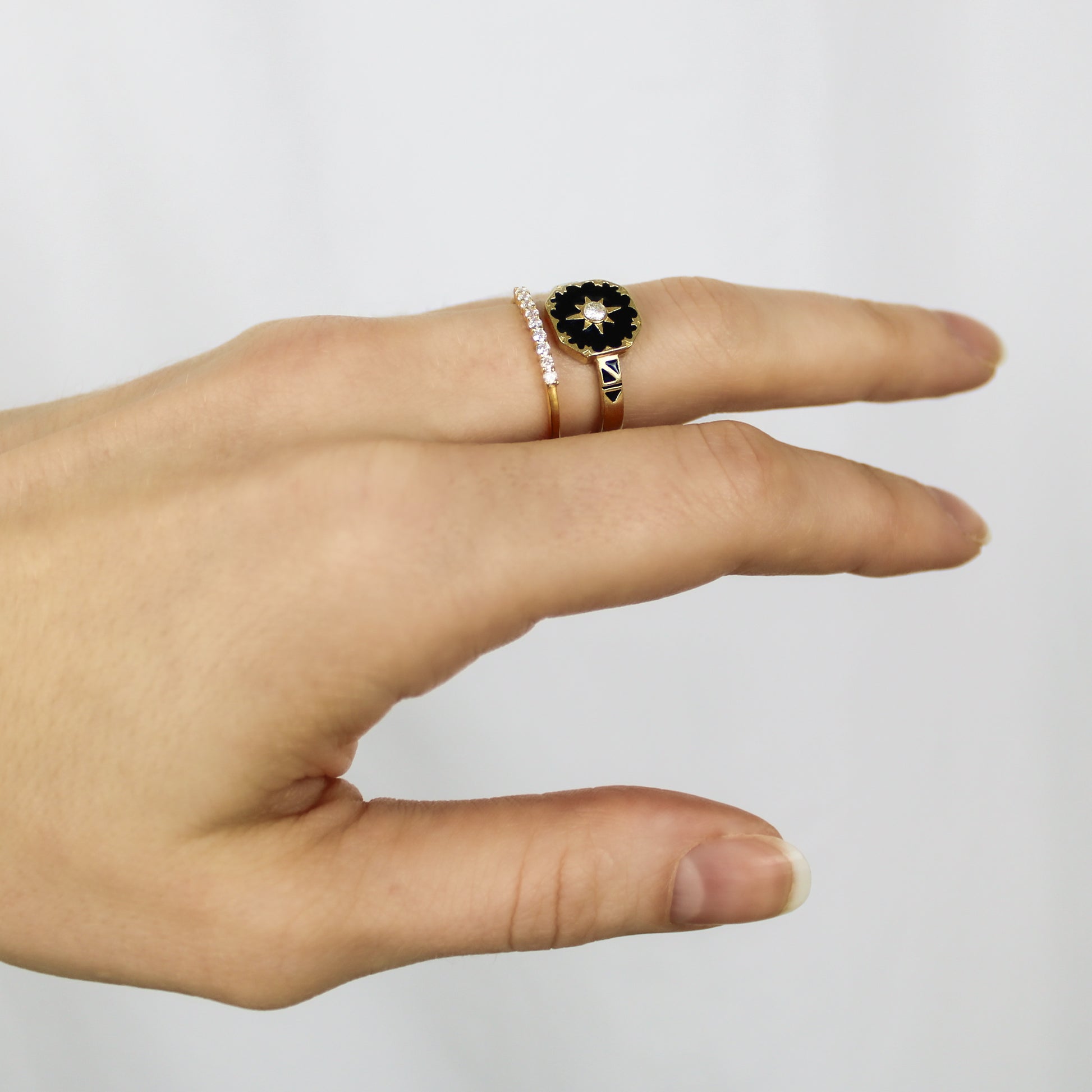 At its center, a luminous gemstone rests inside a sculpted metal star, set against a pool of jet-black enamel. Intricate engravings frame the enamel face, adding dimension and historic charm. The band carries additional enamel detailing that creates a seamless flow of light and shadow. Every line, curve, and star was inspired by antique mourning and celestial motifs crafted to feel timeless, bold, and deeply intentional.