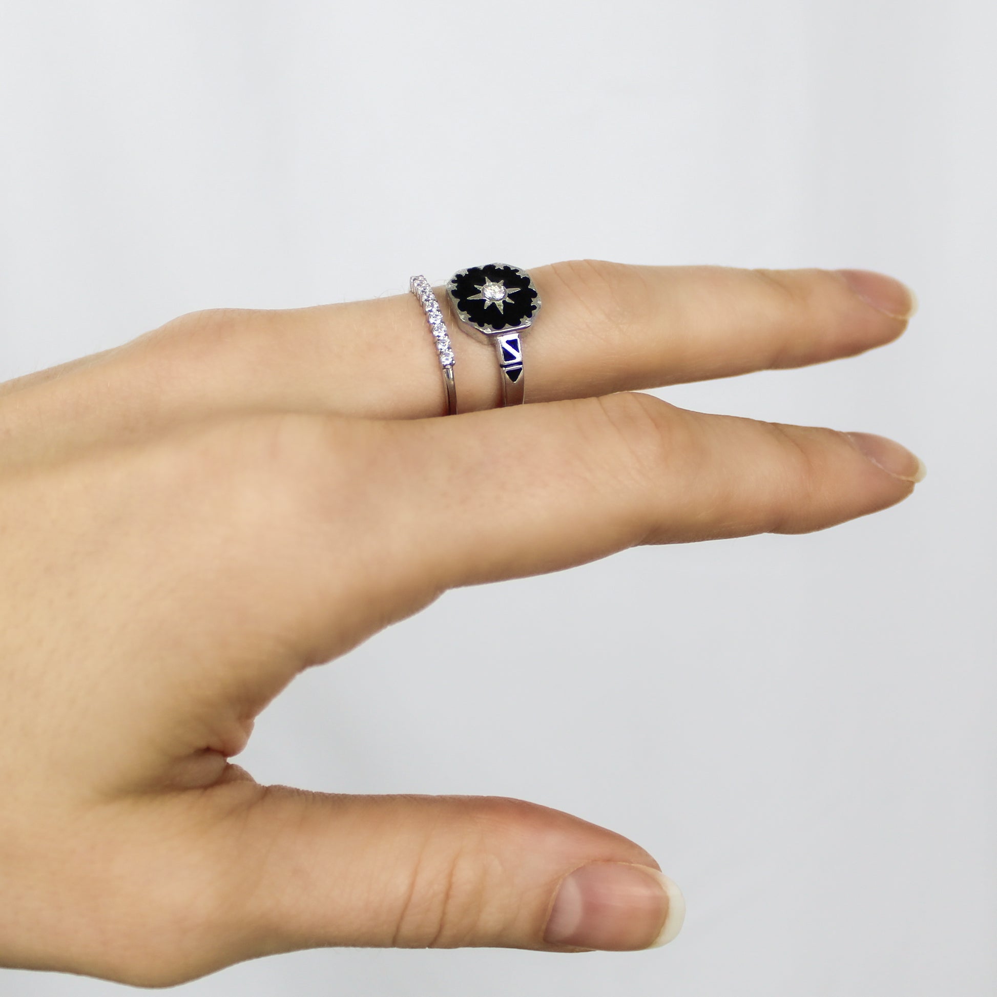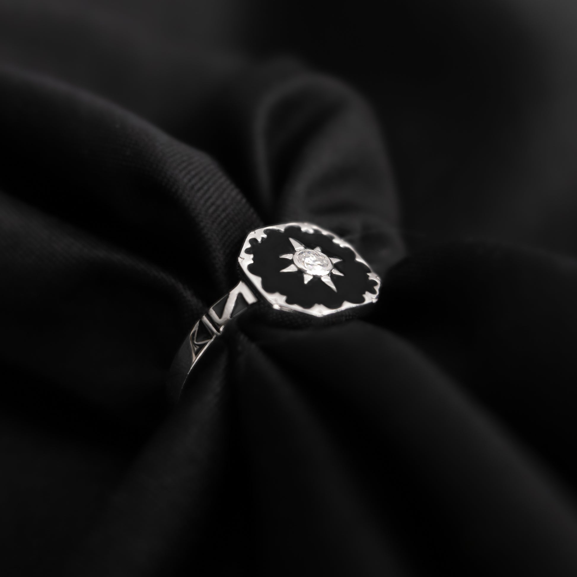 At its center, a luminous gemstone rests inside a sculpted metal star, set against a pool of jet-black enamel. Intricate engravings frame the enamel face, adding dimension and historic charm. The band carries additional enamel detailing that creates a seamless flow of light and shadow. Every line, curve, and star was inspired by antique mourning and celestial motifs crafted to feel timeless, bold, and deeply intentional.
