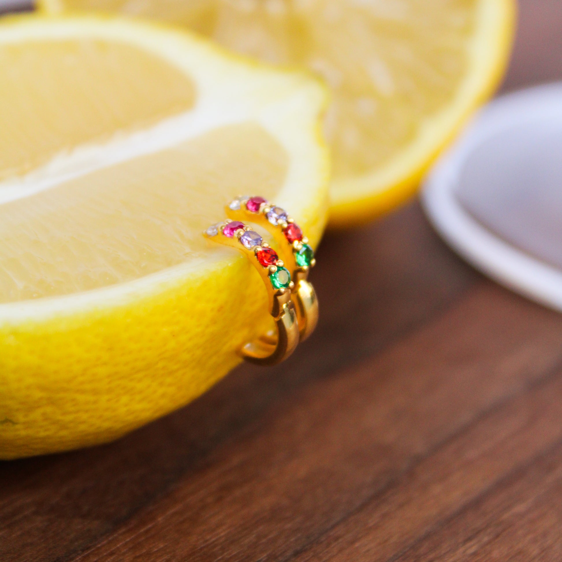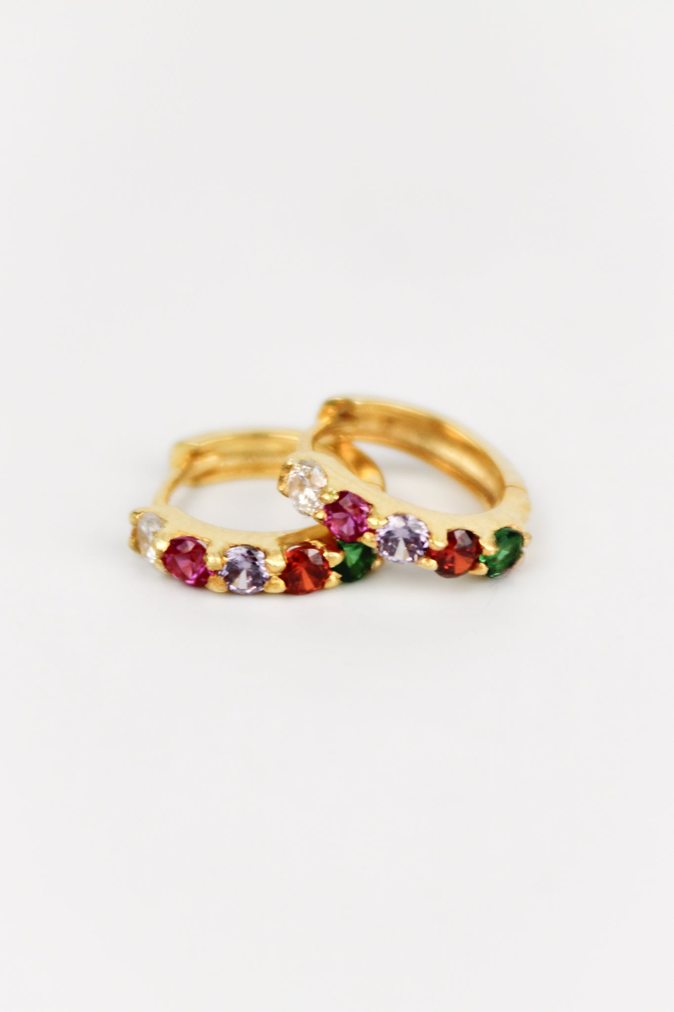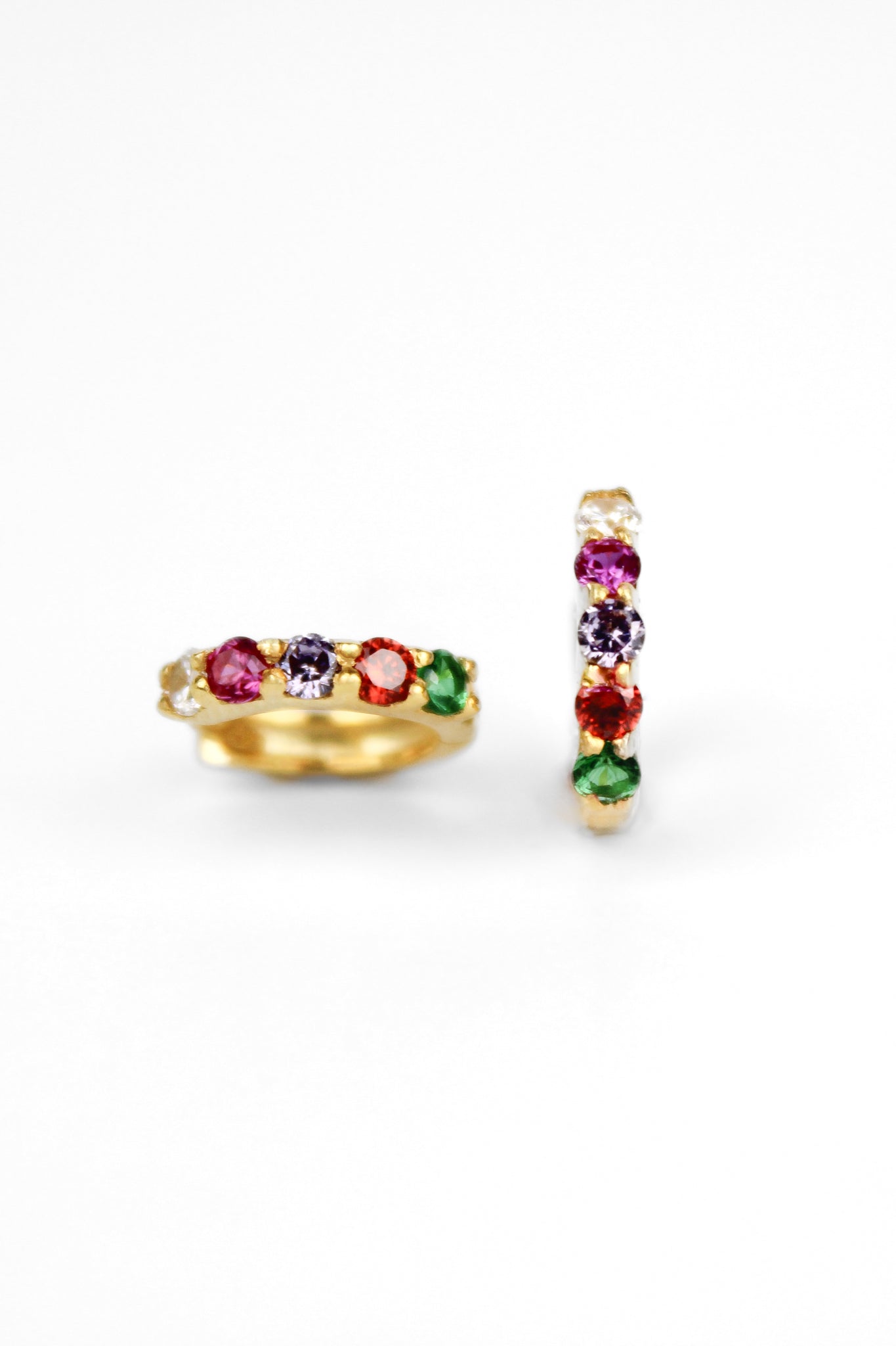 Each huggie holds five meticulously set gemstones, arranged in a radiant arc that hugs the ear with soft, effortless elegance. Crafted in rich 18k gold vermeil, the stones are prong-set to let the light pass through them with clarity and color. The hinge closure clicks securely into place, making them comfortable enough for everyday wear while still luminous enough for a night out.