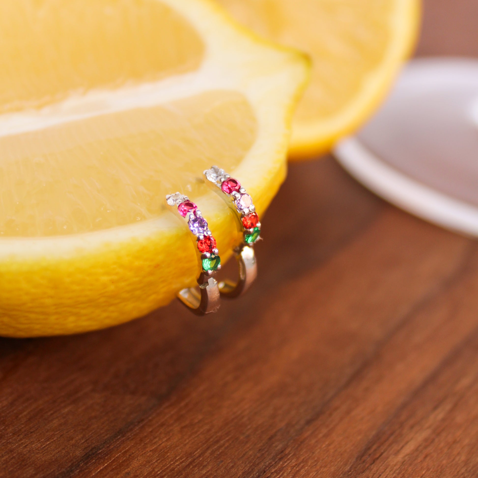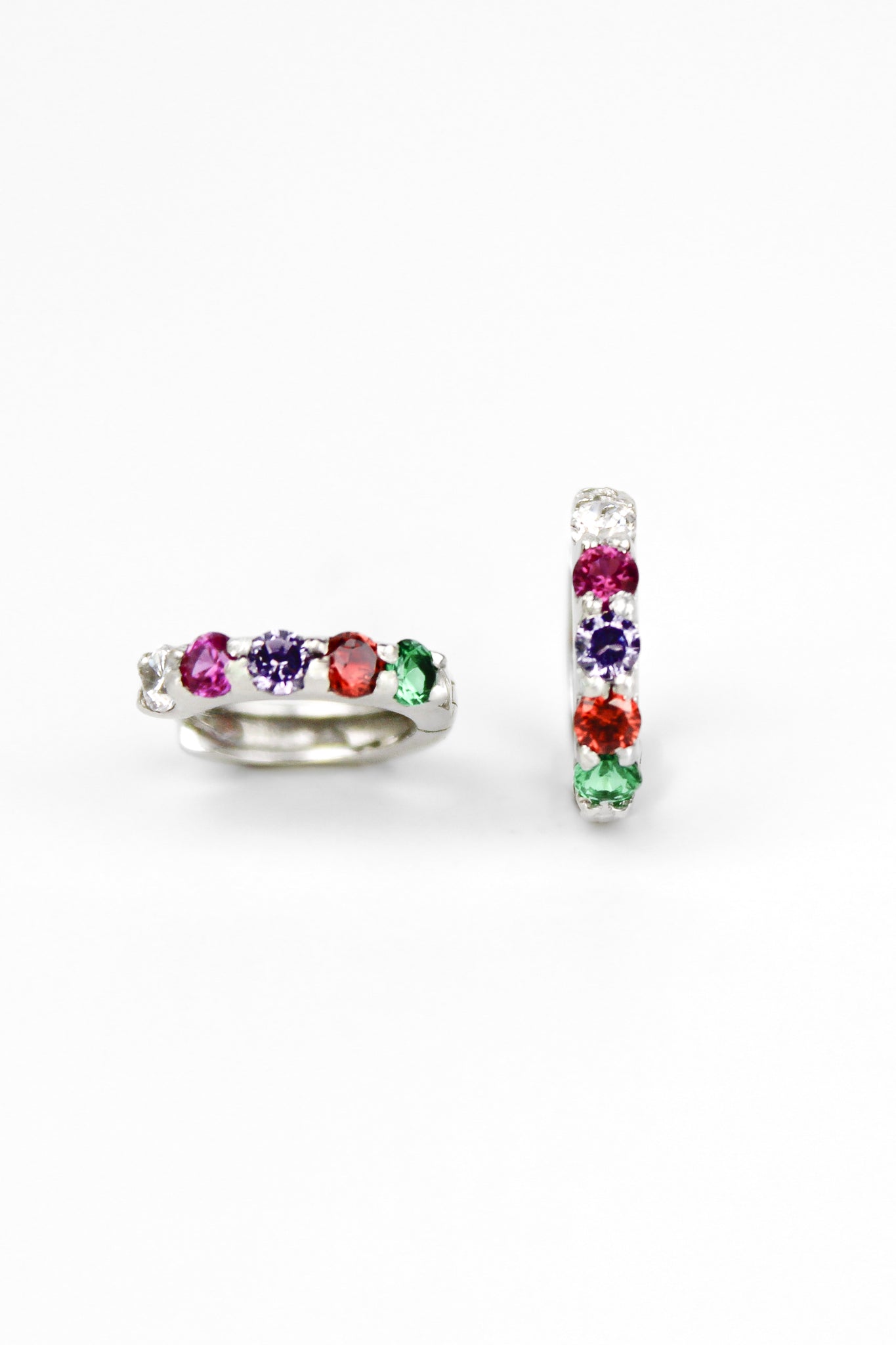 Each huggie holds five meticulously set gemstones, arranged in a radiant arc that hugs the ear with soft, effortless elegance. Crafted in polished sterling silver, the stones are prong-set to let the light pass through them with clarity and color. The hinge closure clicks securely into place, making them comfortable enough for everyday wear while still luminous enough for a night out.