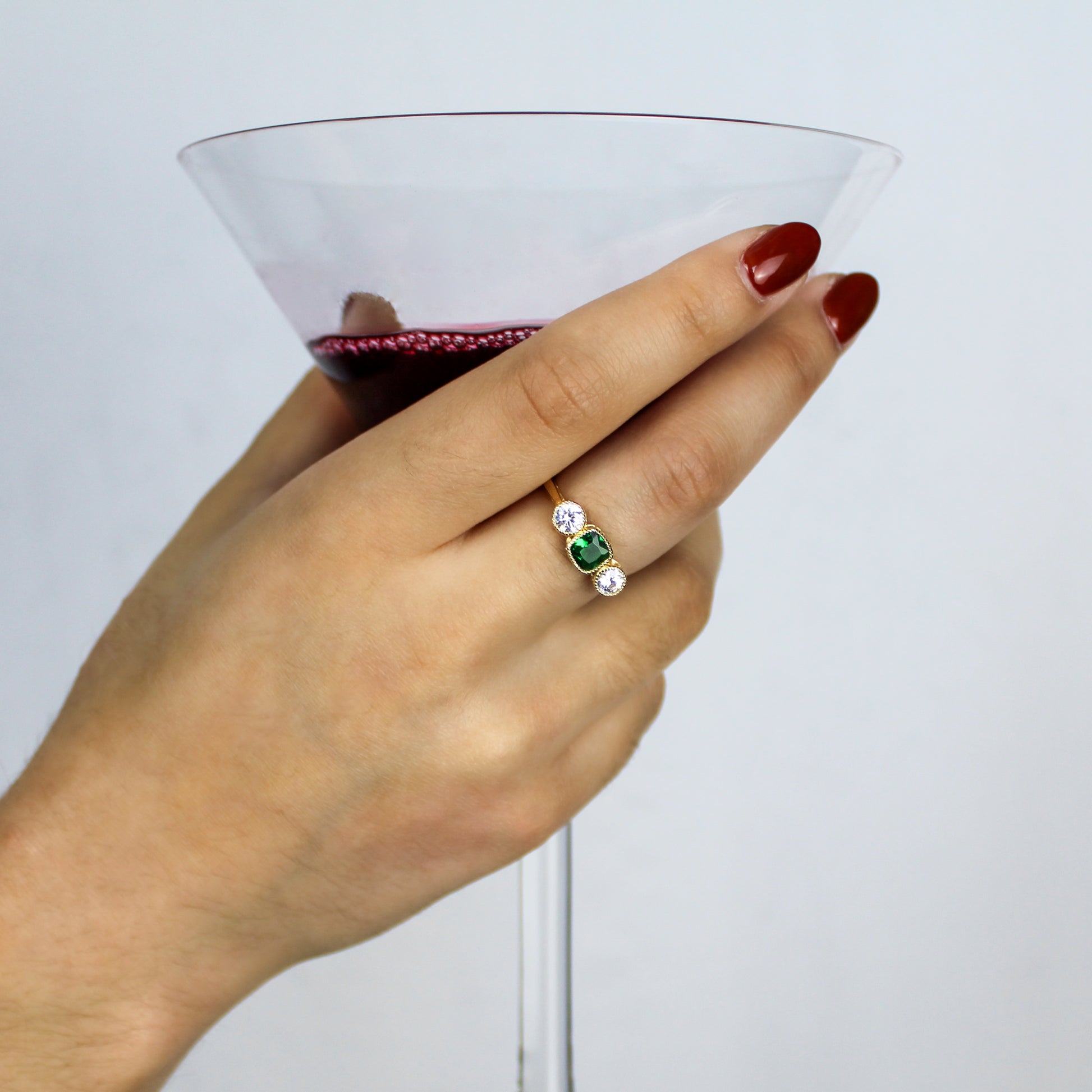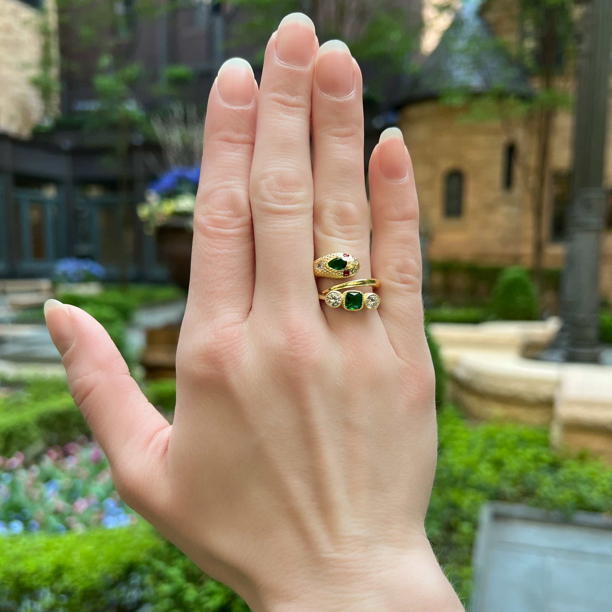 Crafted in gold-plated sterling silver, this ring features a luminous green center gemstone in a beaded bezel setting, flanked by two radiant accents. Along the bridge, delicate Edwardian filigree work adds depth, romance, and the kind of detail only found in heirloom designs. Its soft curves and tapered band create a silhouette that feels both historical and effortlessly modern.