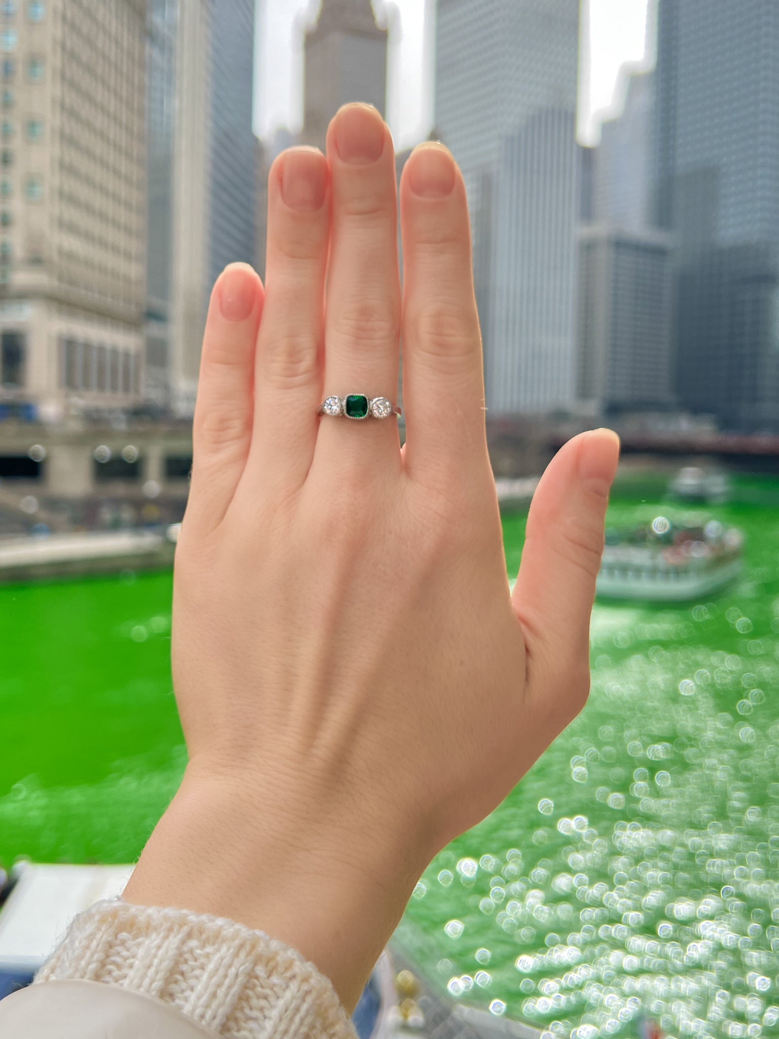 Step into the elegance of a bygone era with this exquisite Edwardian Three-Stone Ring. The three-stone design was often symbolic of a love journey representing the past memories, the present love, and the future commitment.